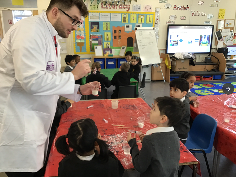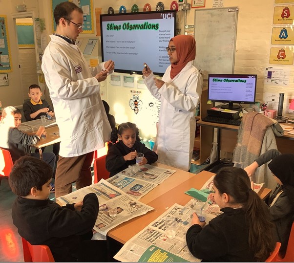 February 2023: Adibah, Aisha, Barnabas, Megan, Pete and Ryan delivered a day of slime making at St Gabriel’s CofE Primary School as part of the schools STEM week. 200 children made two different types of slime and compared the properties of the slime for observations.