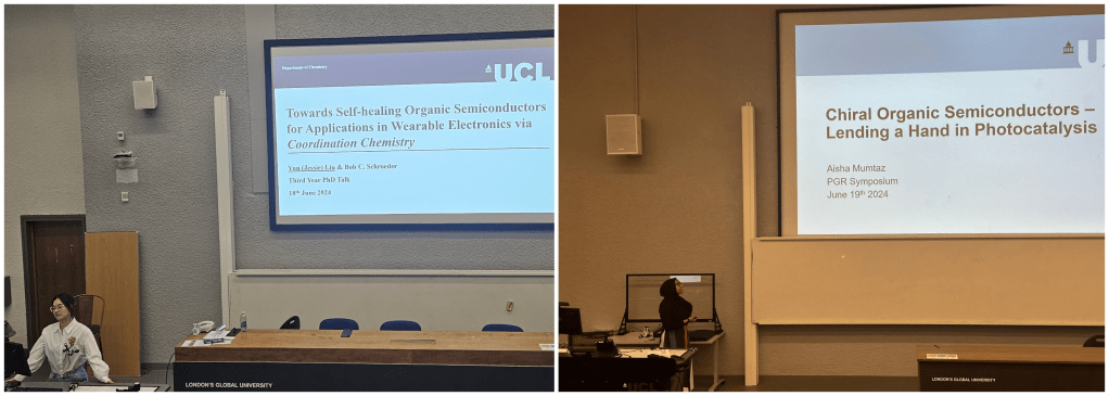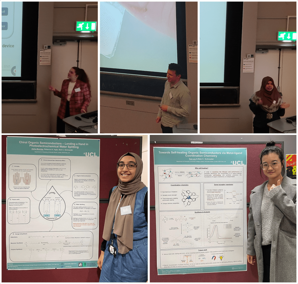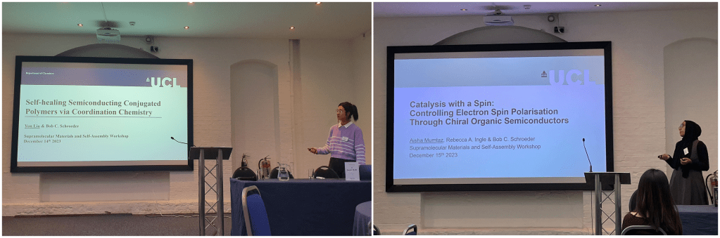 December 2023: Jessie and Aisha presented their work on self-healing coordination polymers and chiral organic semiconductors, respectively, at the Supramolecular Materials and Self-Assembly Workshop in London.