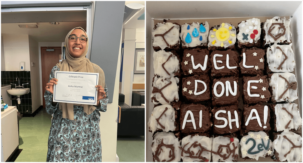 June 2024: Meet this year’s Gillespie Prize winner for the best presentation in Materials Chemistry, our very own Aisha. To celebrate, Adibah’s delicious brownies say it all. Well done, Aisha!