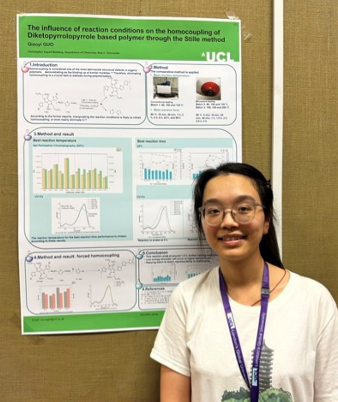July 2025: Qiaoyi presented her compelling research on structural defects in conjugated polymers and reaction conditions at this year’s MSc poster event at UCL. Nice job Qiaoyi!