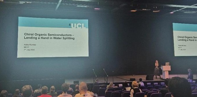 July 2025: Aisha took the stage at RSC MC17 in Edinburgh, presenting her work on water splitting using chiral organic semiconductors. Fantastic job representing the group!